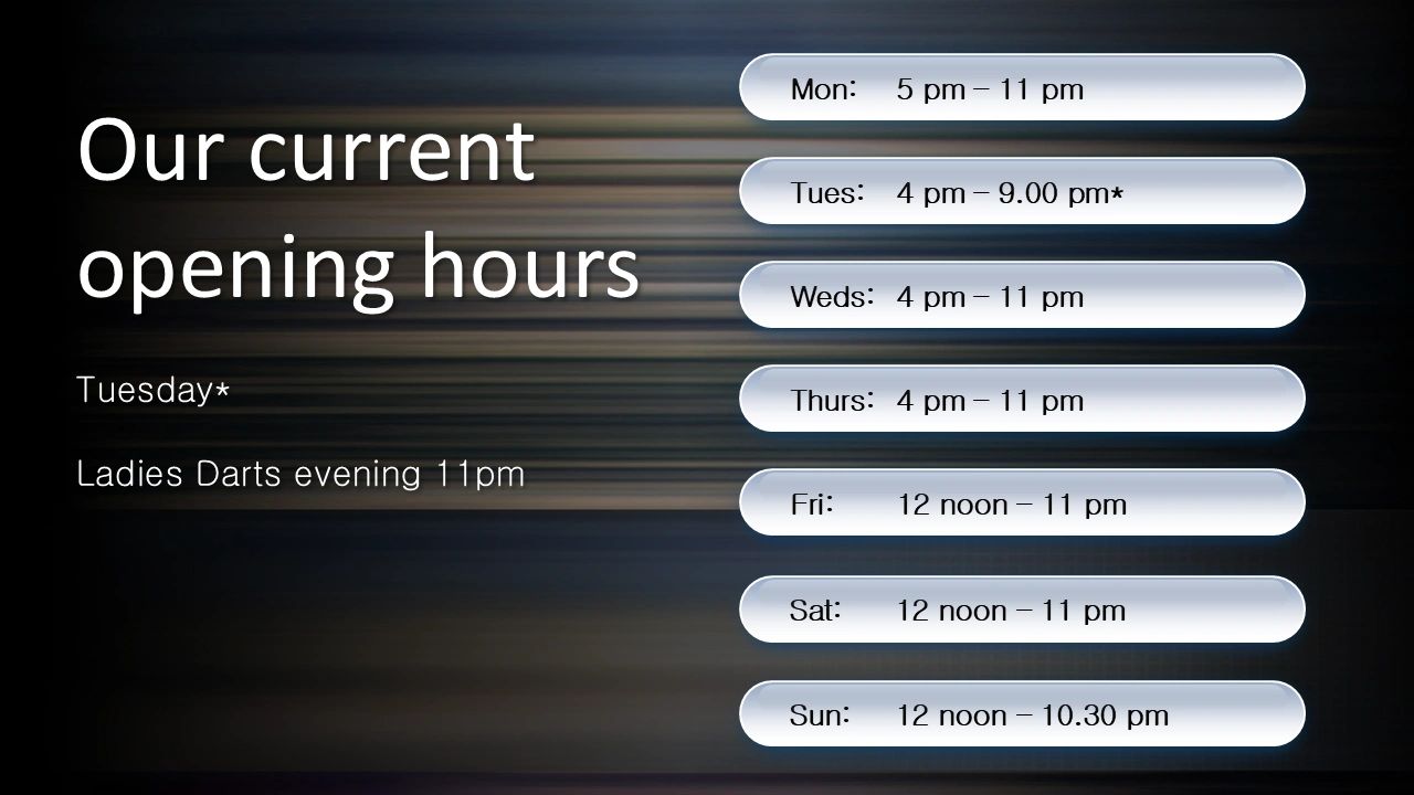 We have new opening times, serving a constantly updated range of drinks, and serving lunches (Friday, Saturday and Sunday) and evening meals (Monday to Friday), with our local favourites on the menu, and new menu choices just added!